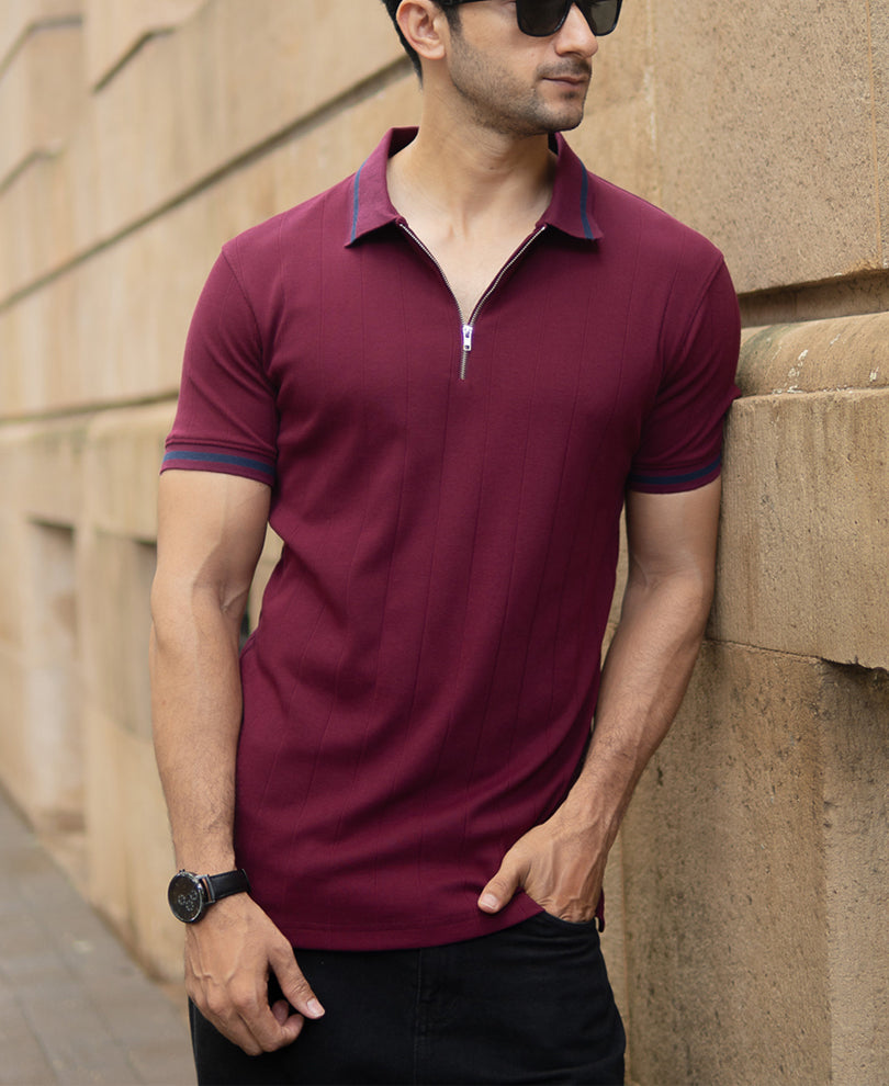 Grey Structured Regular Fit Half Sleeves Zipper T Shirt