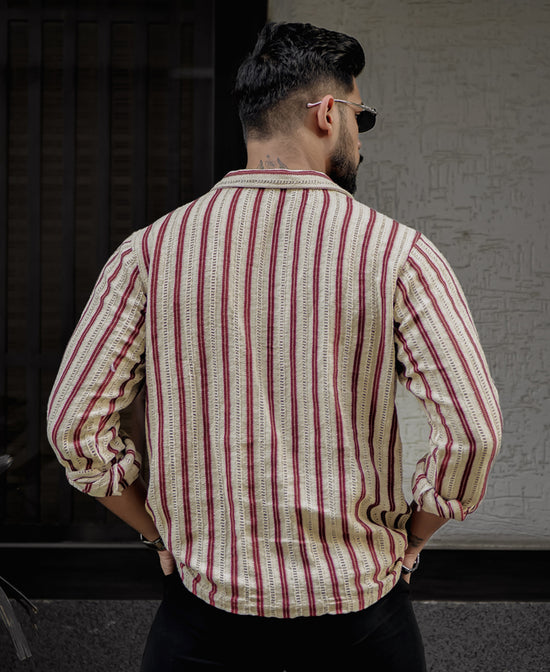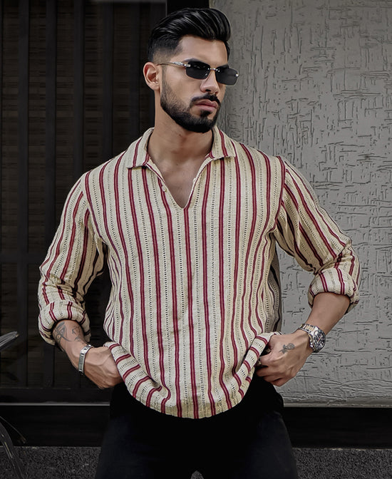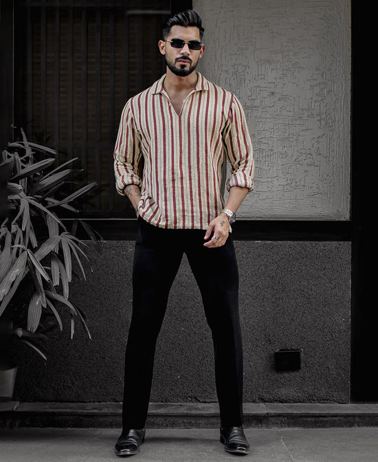 A modern twist on tradition, this beige and maroon striped kurta-style shirt combines effortless charm and comfort. With full sleeves, a collar neck, and intricate crochet detailing, this shirt is made for the man who appreciates subtle sophistication with a touch of flair.