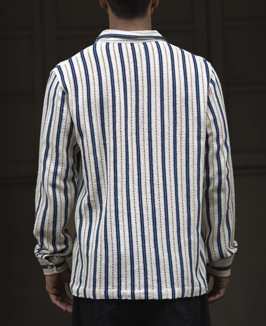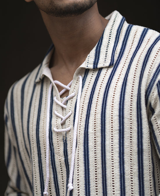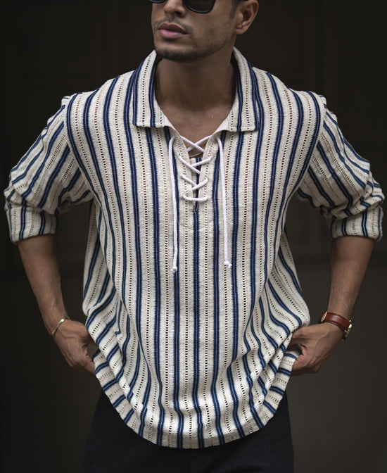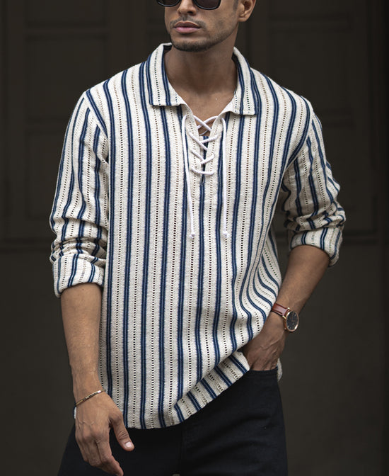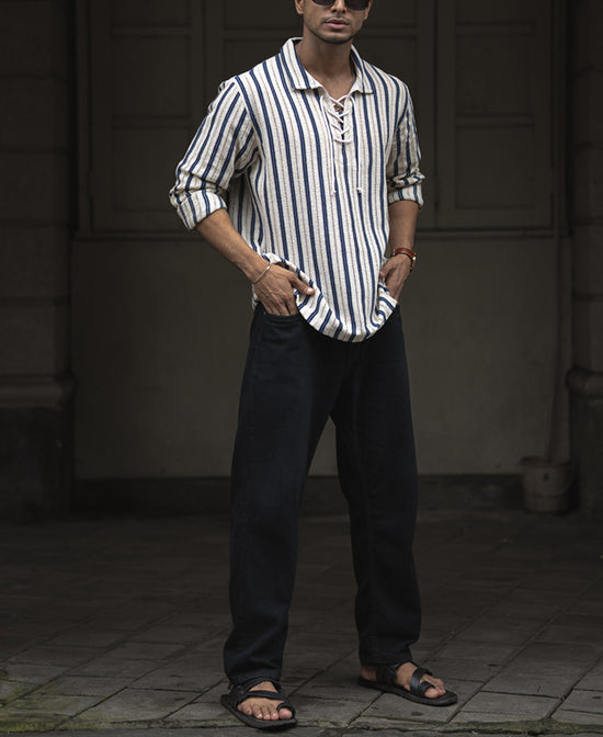 Beige And Navy Blue Striped Regular Fit Full Sleeves Kurta Style Shirt