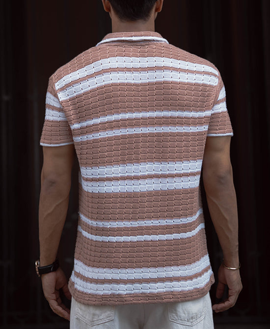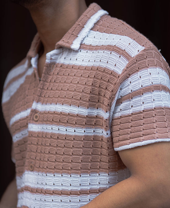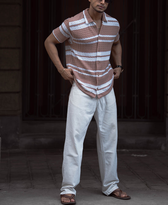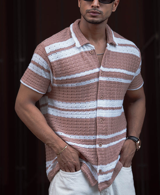Embrace vacation vibes with our beige and white striped shirts for men, featuring warm horizontal stripes reminiscent of sandy beaches. Crafted from lightweight, premium fabric, it's perfect for resort wear or pairing with baggy bottoms. The relaxed fit and breathable material keep you comfortable whether you're exploring coastal towns or enjoying beachfront dinners.