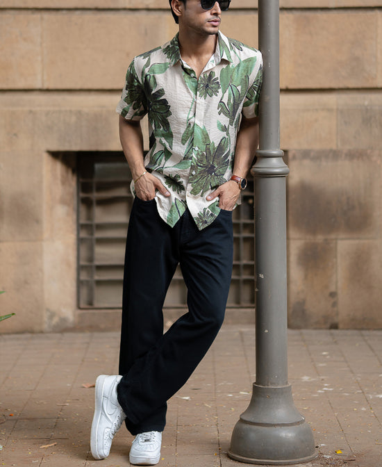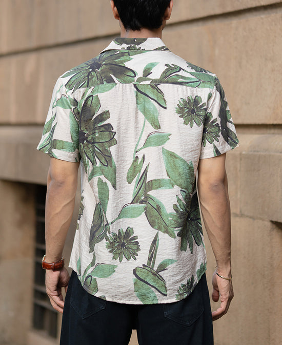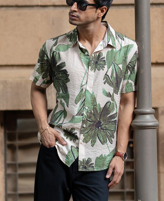This beige floral shirt isn't your typical beachwear. Oversized green blooms and relaxed structure give it effortless cool with a confident punch. Lightweight and breathable, it’s built for sunny getaways or rooftop weekends.