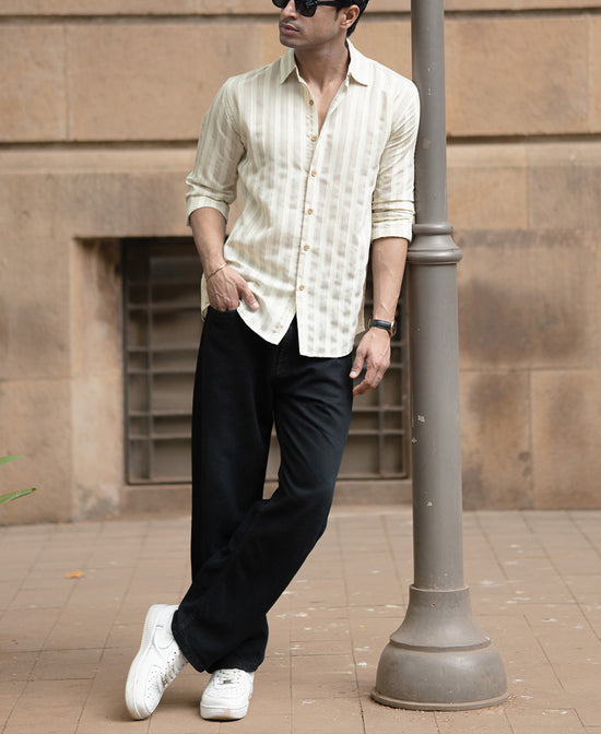 Subtle texture, serious polish. This Beige full-sleeve shirt features self-stripes and a refined structure that sets it apart from your basic neutrals. Whether it’s a casual Friday at work or a sundowner scene, this one plays it cool. Tuck it in with chinos or leave it out over jeans for a powerful move
