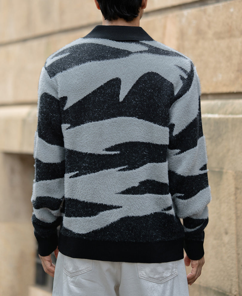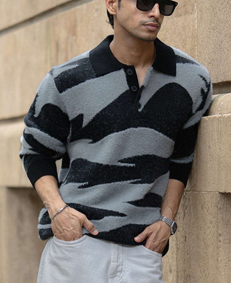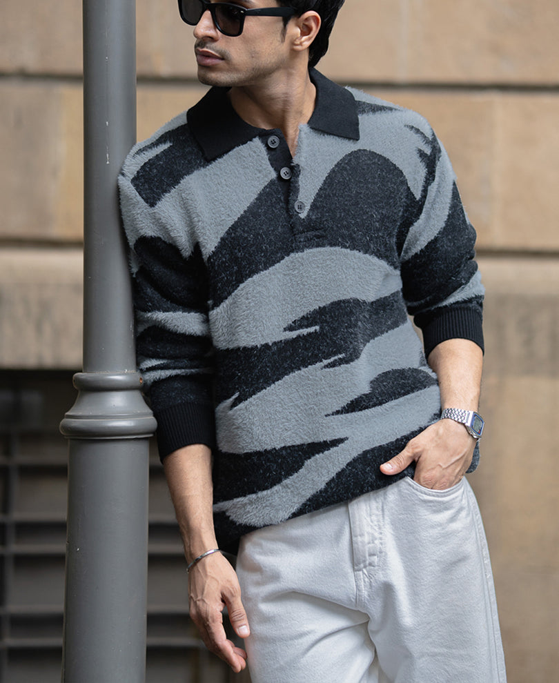 Bold, unapologetic, and distinctly modern. With its monochrome abstract jacquard design and polo collar, this sweater blends structure with chaos in the best way possible. Wear it when you want your outfit to speak before you do.