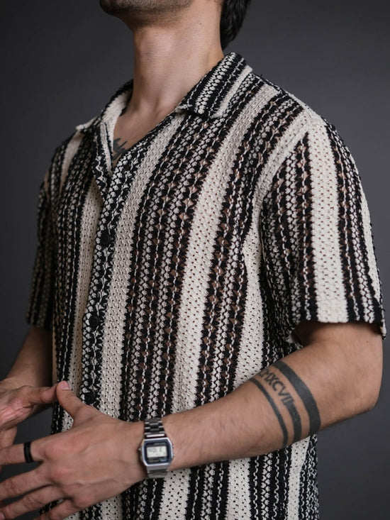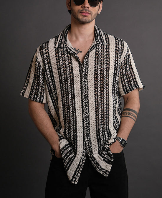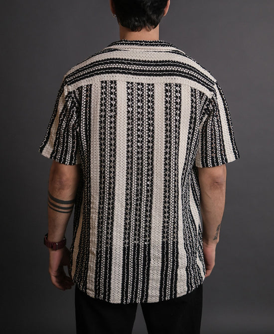 Black and White Crochet Knit Striped Half Sleeves Shirt