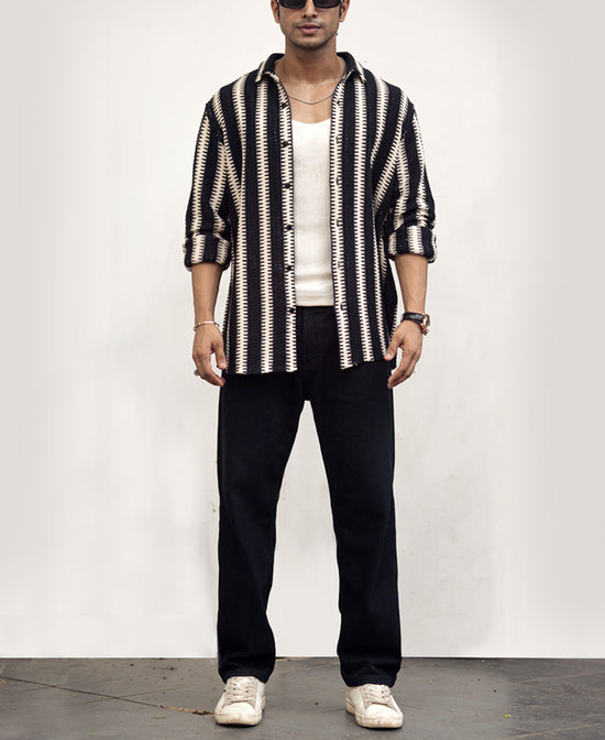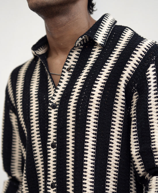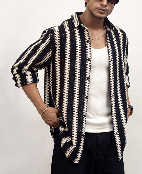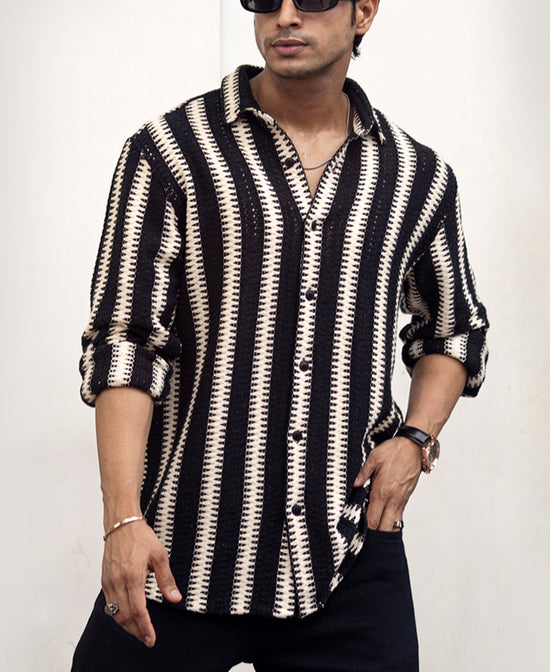 Black And White Striped Regular Fit Crochet Full Sleeves Shirt