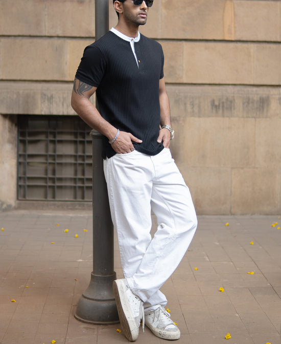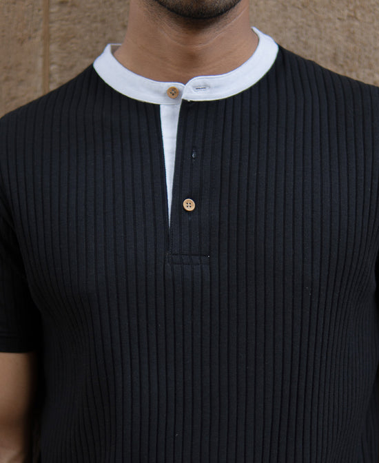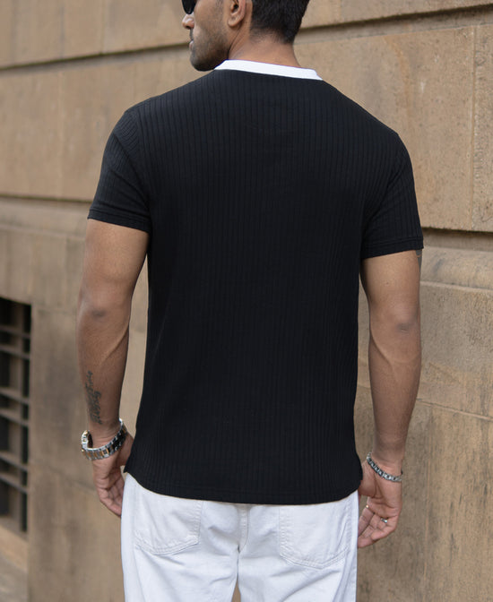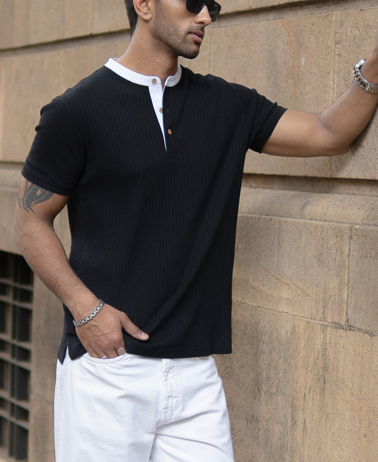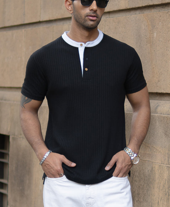 Keep it classic but with a twist in our Black Contrast Collar Henley T-Shirt. Made from breathable cotton, it features a sleek buttoned placket and a sharp contrast collar for that elevated edge. Easy to wear, easy to pair; built for everyday moves with standout appeal. Perfect for smart casual and pinteresty looks, it's a must have for the fashion-forward men.