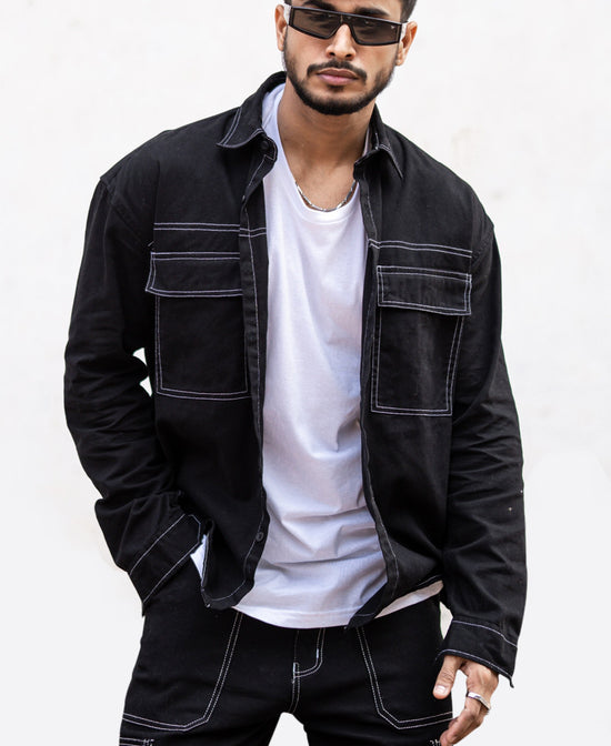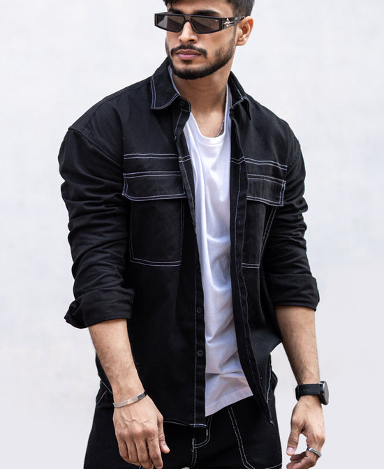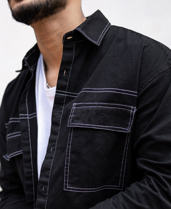 Black Contrast Stitch Oversize Drop Shoulder Shirt D