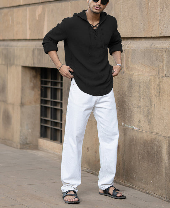 City-cool meets chill-core. The Black Crinkled Hooded Shirt is lightweight, laid-back, and made for low-effort days that still need high-style presence. With its relaxed hood, cross-tie neckline, and breathable structure, it’s a festival essential, a travel staple, or just your everyday “don’t stress it†fit.