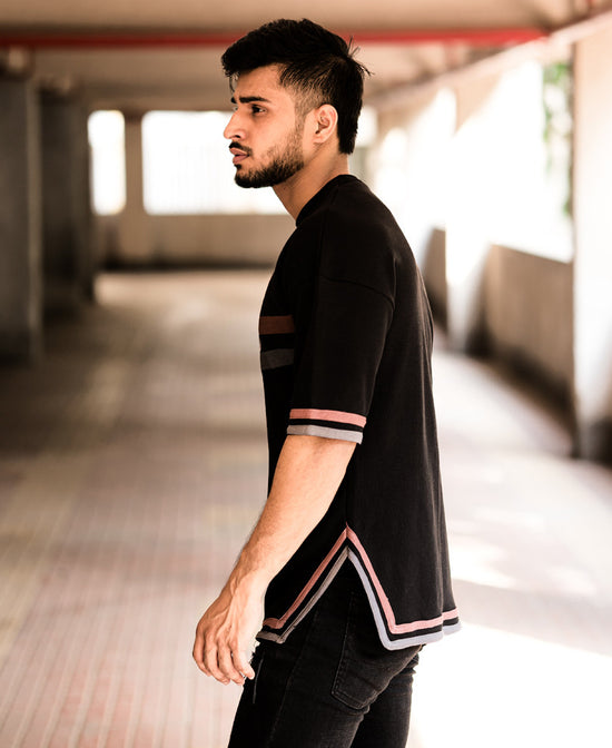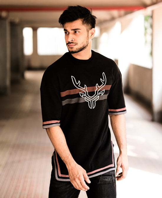 Black Deer Chest Stripe Oversize Drop Shoulder T Shirt