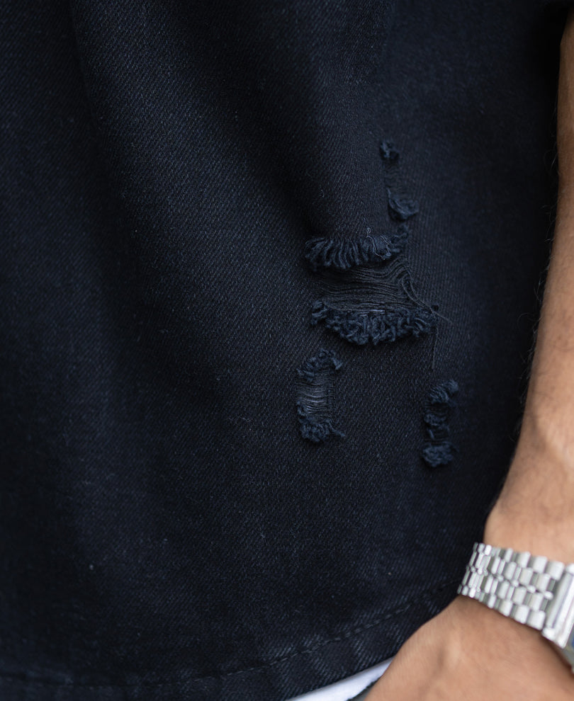 A fusion of shirt and jacket energy, this black distressed overshirt is built for the bold. Washed and worn for character, it brings a rugged appeal that layers perfectly over tees or turtlenecks. Pair it with any of your shirts or tees and make yourself any time party-ready.
