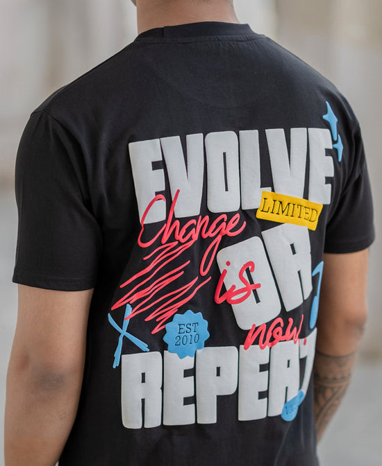 Your go-to black tee, now with purpose. The bold "Evolve" print adds energy to your look, while the easy fit makes it wearable for anything your day throws at you. Whether it’s a workout session or a weekend hang, this shirt keeps up, no sweat.