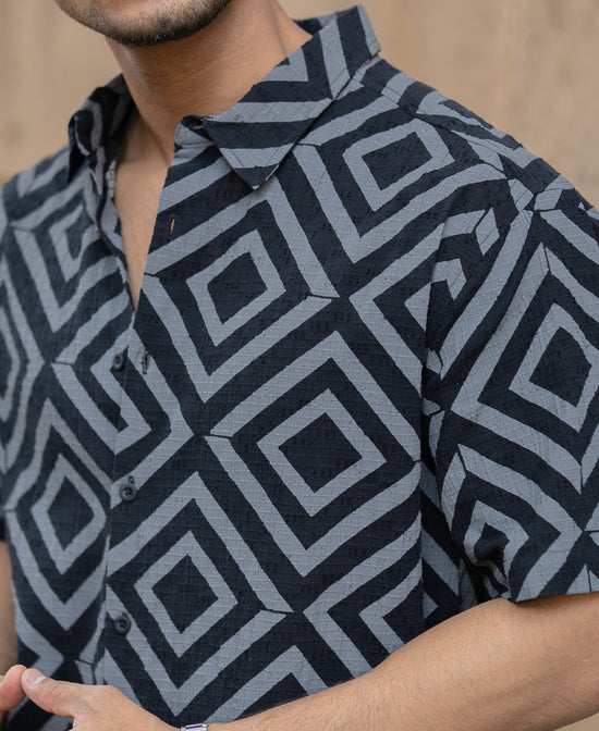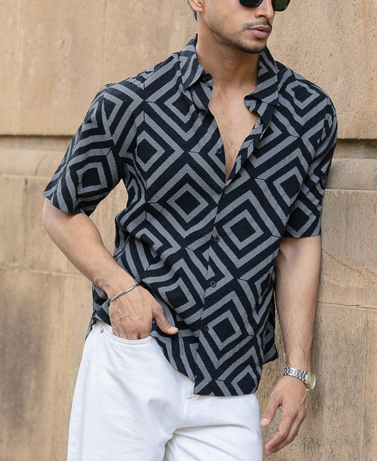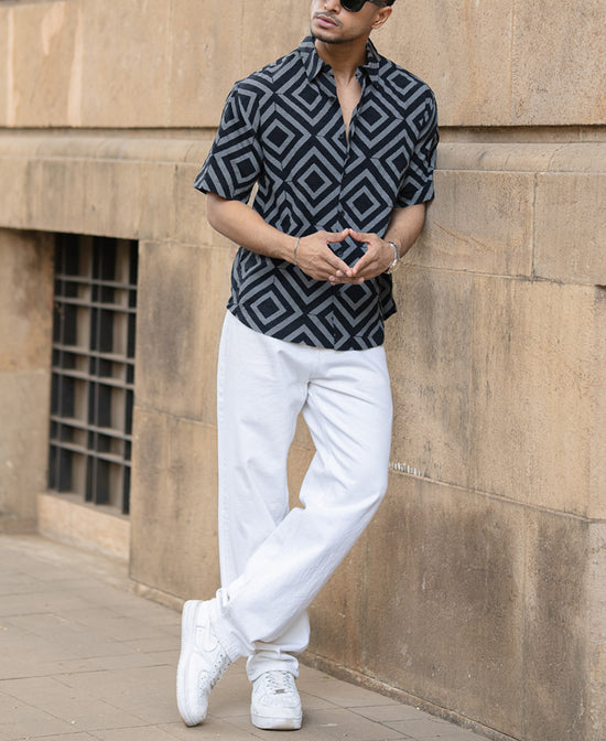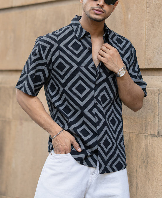 This Black Geometric Printed Shirt with short sleeves and a shirt collar brings structure to spontaneity. Bold patterns set against a clean black base, paired with a front button placket, help you strike the right note between statement and subtle. Smooth in texture and sharp in presence, it falls at the hips and is cut in a relaxed fit. This one’s made to break the routine effortlessly.