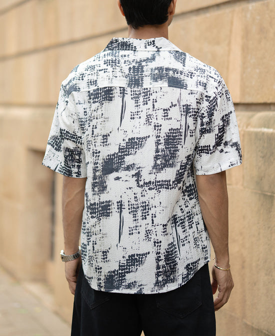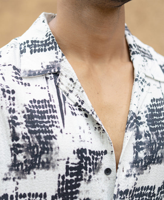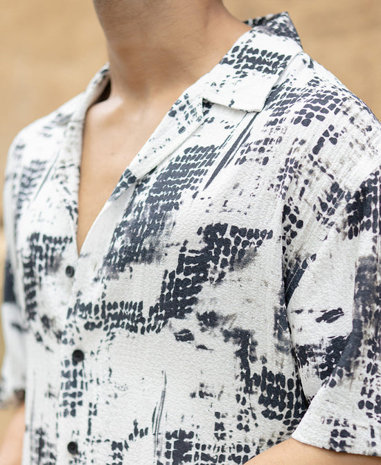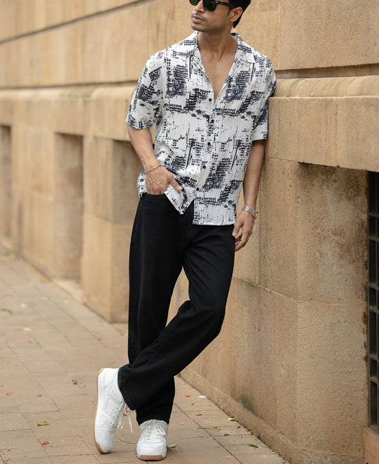 Artfully abstract, this black Cuban collar shirt is a bold visual statement. The monochrome ink-blot pattern gives it a contemporary, gallery-ready flair.