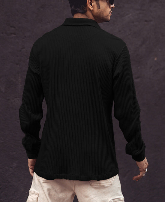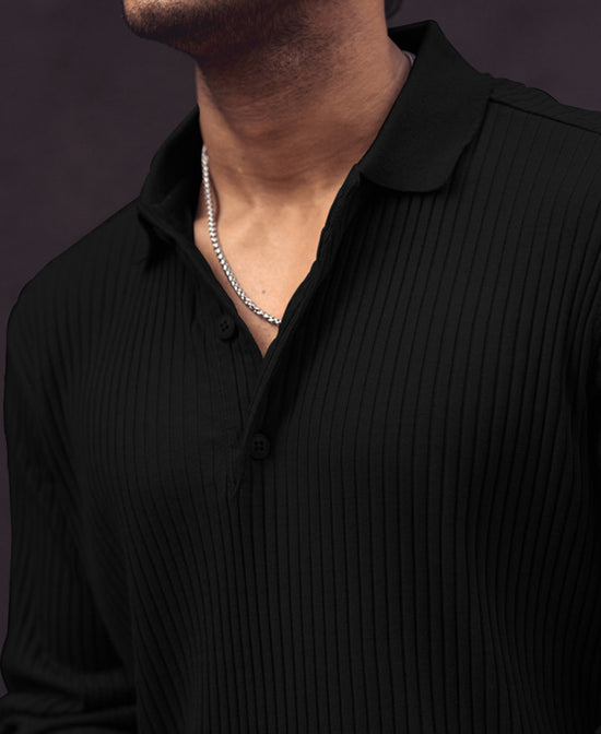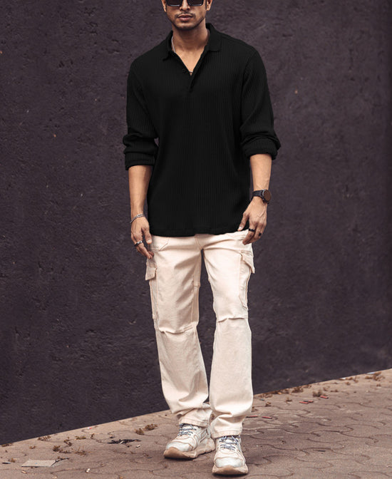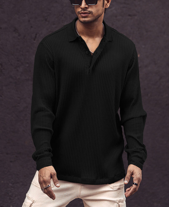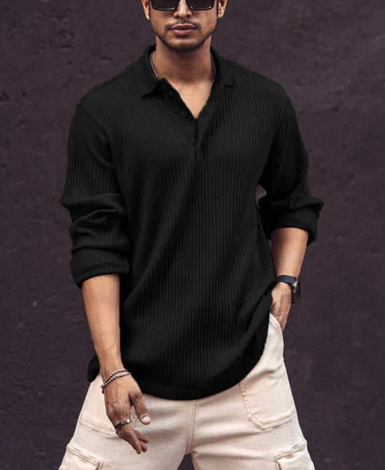 Giving the humble black tee an elevated update - Black rib-knit oversized t-shirts for men, featuring a polo collar, drop shoulders, and full sleeves. Cozy, relaxed, and made with Knitted Cotton fabric, the oversized t-shirt transits effortlessly between occasions. Dress it up or down with your existing trousers, and you are all set.