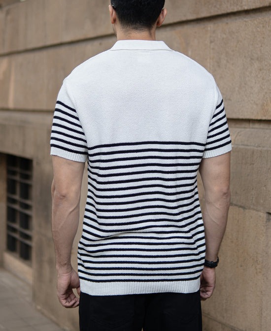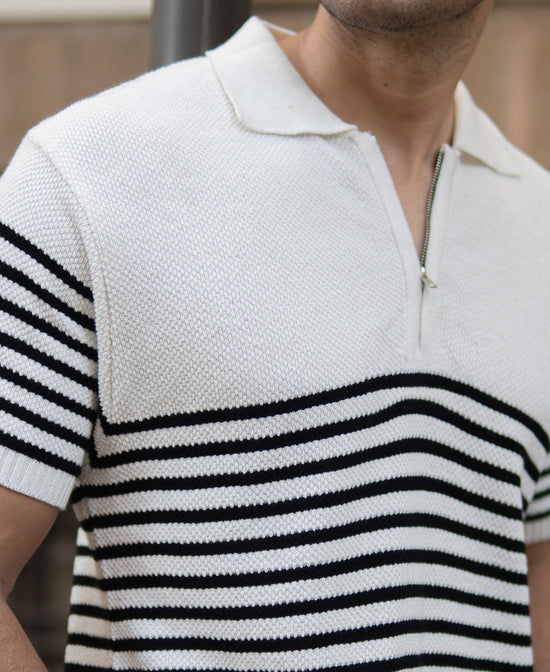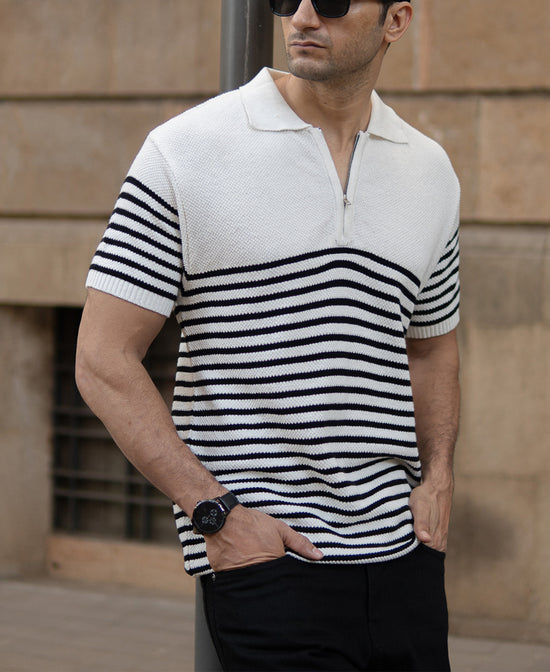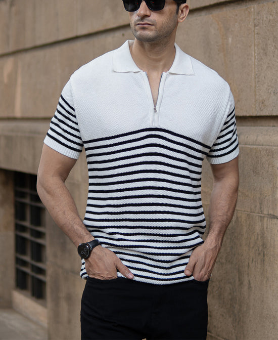 This knit zipper tee combines crisp black-and-white stripes with a structured knit texture that feels both relaxed and refined. The half-zip collar adds versatility—wear it open for a breezy casual vibe or zipped for a polished finish. Perfect for days when comfort meets sophistication.