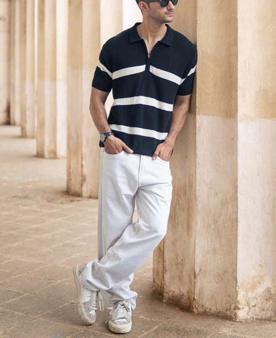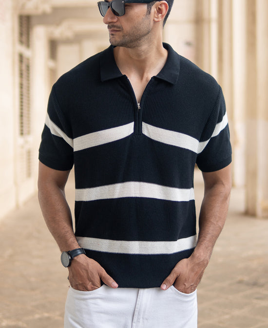 Effortlessly retro. The horizontal ivory stripes on the rich black knit make this polo feel like a time-travel ticket to good old days. The zip-up collar adds a sporty touch, while the textured knit keeps things elevated. Match it with tailored shorts or white denims for a clean summer fit for new day slay as well as for old money vibes.