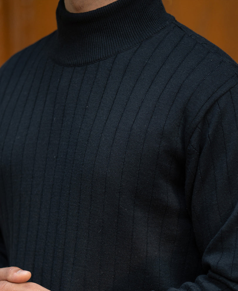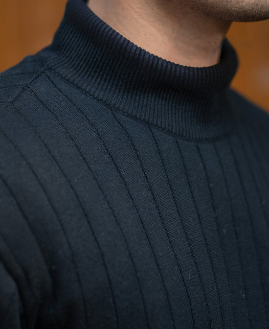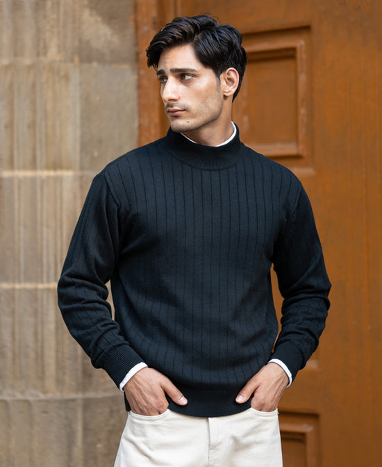 Embrace the cold with this Black Structure Stripe High Neck Sweater. Its snug fit and warmness make it a winter essential for Indian wardrobes, it also redefines smart layering with a vertical rib texture that sculpts your silhouette. Its mock neck adds quiet confidence, while the fine-knit finish keeps things versatile without compromising on style.
