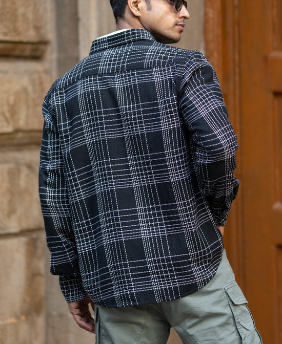 Bold yet versatile, the Black Structured Checked Shirt is designed with a textured fabric and classic checked pattern. A timeless piece that transitions seamlessly from workwear to casual evenings.