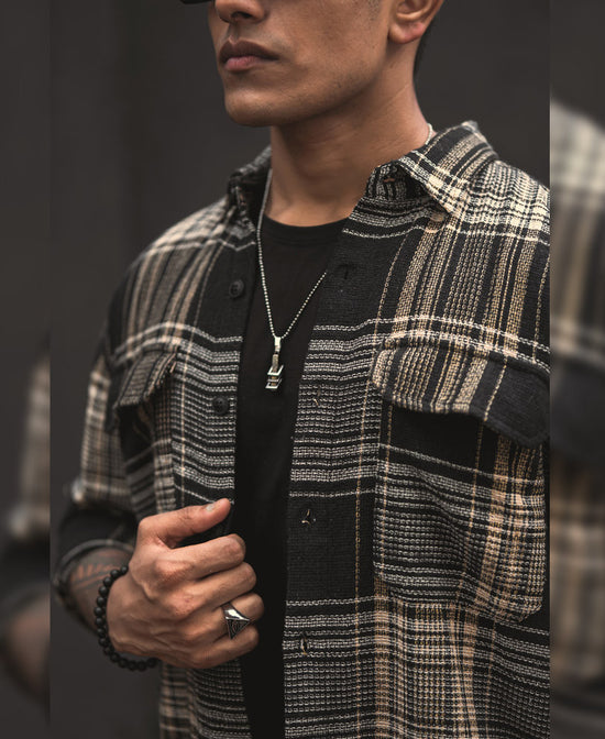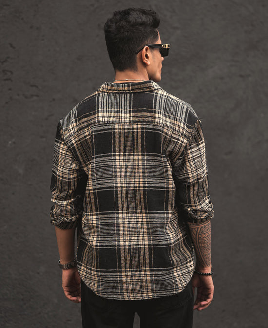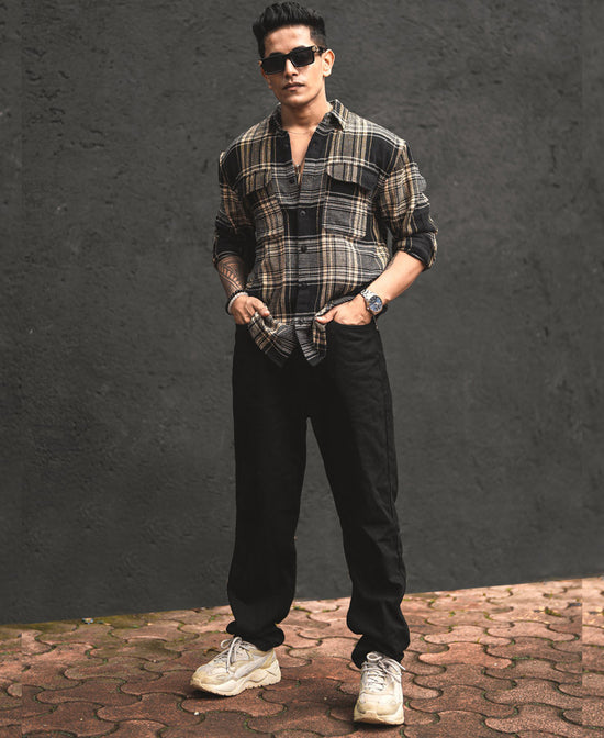 Give yourself an edge in our black structured checks oversized shirts for men with a spread collar, drop shoulders, full sleeves, and two flap pockets. Crafted with sturctured blend fabric, the checked shirt keeps you comfortable on fast-paced days. Pair it solo with denim jeans or layer it over a tee; wear it anyhow to make a statement.