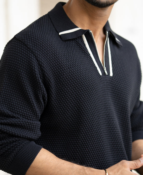 Black Structured Full Sleeves Regular Fit Collar T-Shirt
