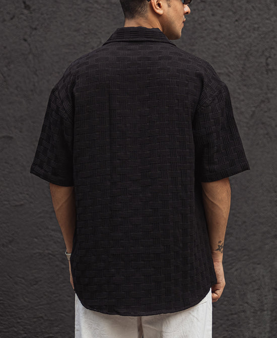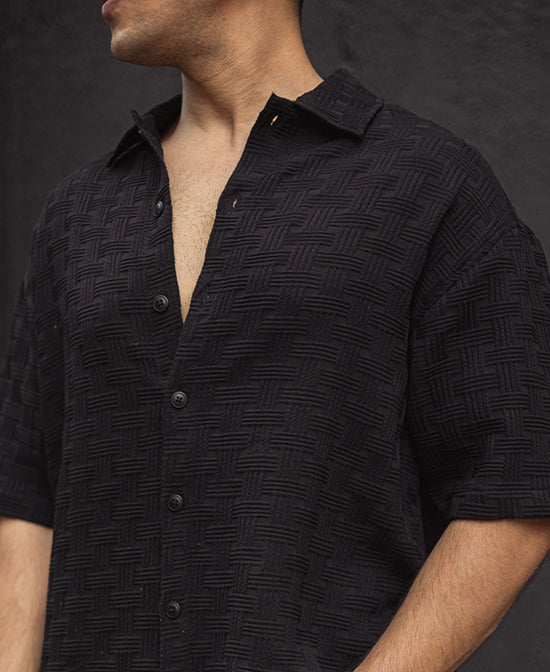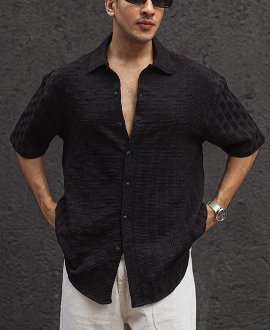 Get back in action with our black structured oversized shirts for men, highlighting a spread collar, drop shoulder half sleeves, and a textured finish. Designed to add a touch of casual elegance to your wardrobe, the oversized shirt is made in Polyester fabric, ensuring a comfort-first look that transits effortlessly from casual outings to semi-formal occasions.