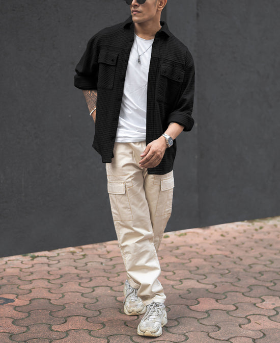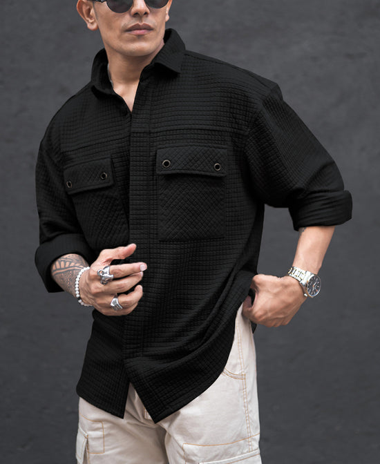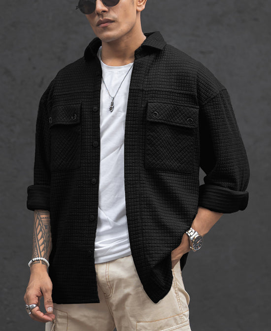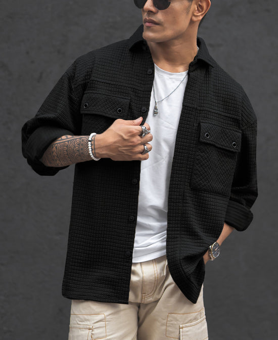 Leave a lasting impression wherever you go with our black knitted full sleeve oversized shirt for men. Crafted from Cotton Blend Fabric it highlights double flap pockets, drop shoulders and a classic finish. It’s a perfect choice for every occasion.