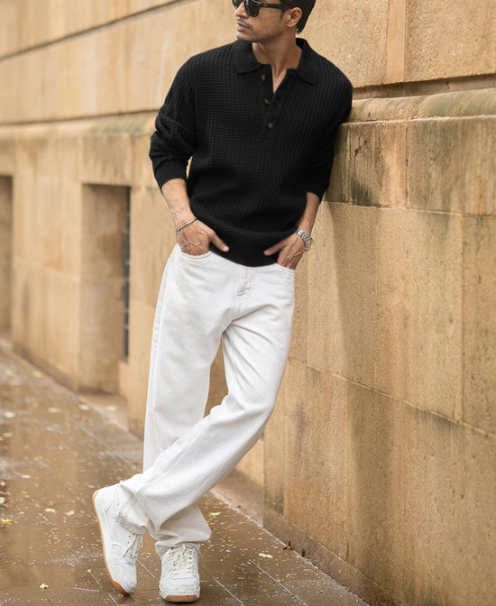 Black Structured Knit Polo T-Shirt