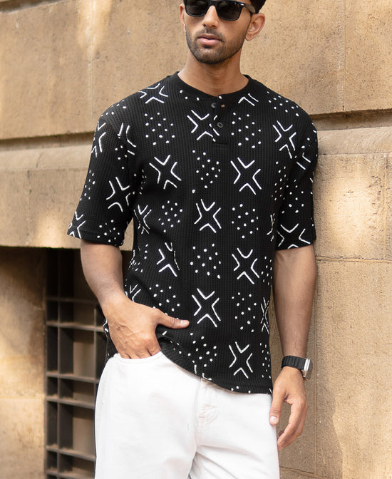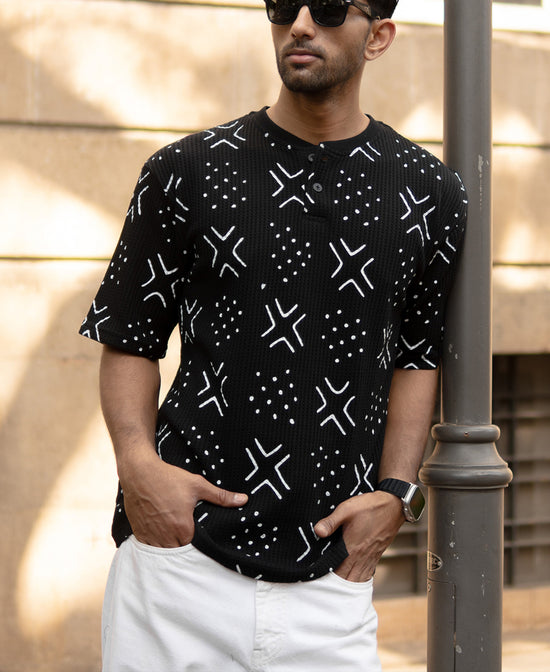 Minimal yet expressive, this black Henley t-shirt features subtle tribal patterns in a textured waffle knit. The structured build and curved hem give it shape, while the monochrome palette keeps it street-smart. An easy staple to anchor your daily fits.