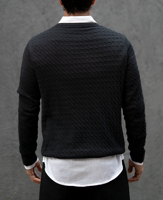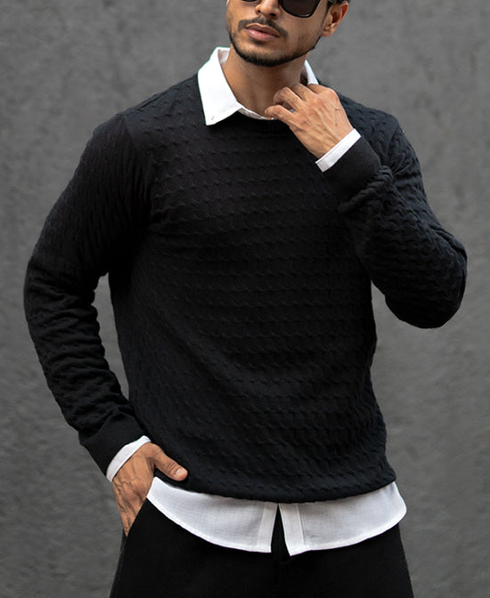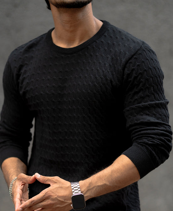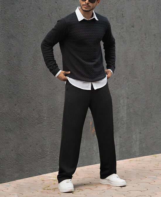 Not your average black tee. This structured full-sleeve t-shirt elevates simplicity with its sharp texture and clean lines. Built for men who want to look sharp without the hassle, it’s the kind of piece that feels as good as it looks.