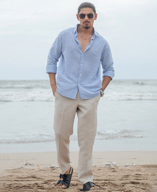 Experience breezy elegance with our blue and white striped shirts for men. The textured fabric and regular fit embody casual refinement, perfect for beach strolls or outings. Roll up the sleeves for a laid-back vibe or keep them down for a more put-together look. This versatile piece pairs wonderfully with khaki shorts or pants, offering both style and comfort for your adventures.