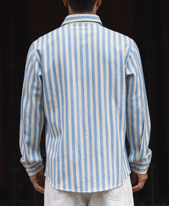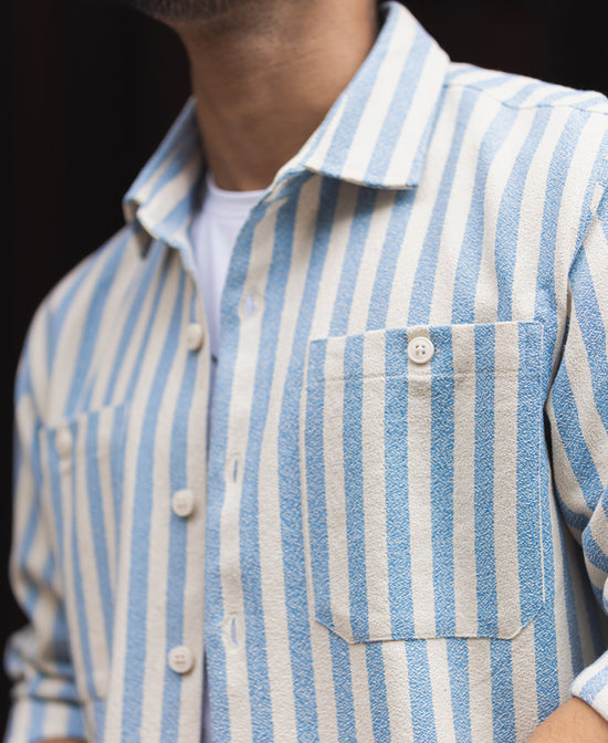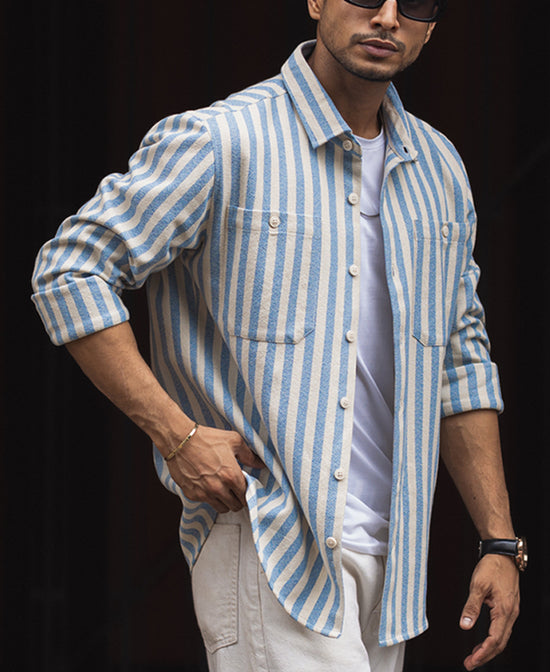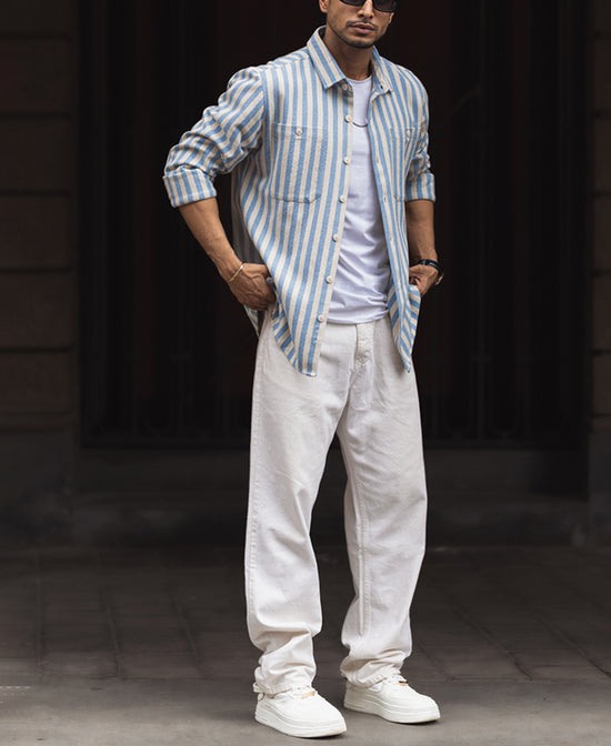 Classic yet contemporary, this blue stripes shirt brings a fresh vibe to your casual wardrobe. The blue and white striped shirt with a structured collar and woven fabric offers all-day comfort while keeping your style sharp. Perfect for a laid-back, yet polished look.