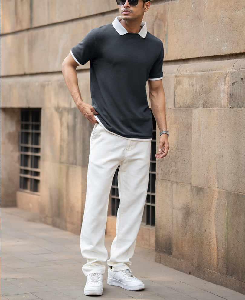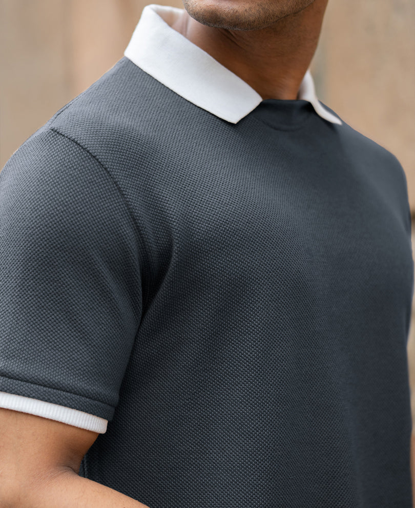 Made from breathable stretch knit cotton, the Blue Contrast Collar Knit T-Shirt delivers a slim tailored fit with smooth drape. It features half sleeves, a structured contrast polo collar, and a defined two-button placket. Ribbed sleeve cuffs maintain shape, while reinforced stitching strengthens durability. Soft feel, controlled structure. Buy this powwerlook Ki=nit T-Shirt now and elevate your you everyday style