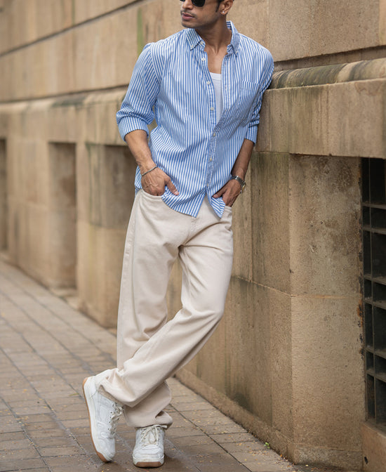 Designed in breathable cotton, this shirt highlights vertical blue and white stripes that elongate the silhouette. The button-down collar and structured finish lend it a polished vibe, making it ideal for workwear or laid-back casual looks. Team it with tailored trousers for formality or jeans for off-duty wear.