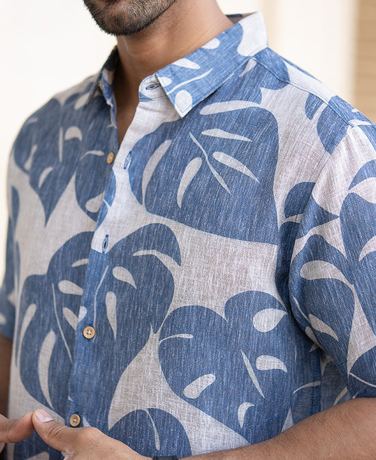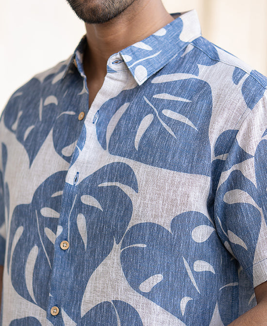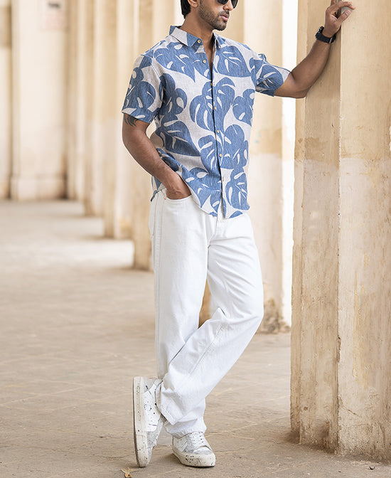 A tropical state of mind. This blue leaf-printed regular fit shirt gives you that easy vacation vibe no matter where you are. The bold leaf pattern adds a fun twist, while the breathable fabric keeps you cool. Whether it's brunch or a beach day, this shirt is an instant mood booster.