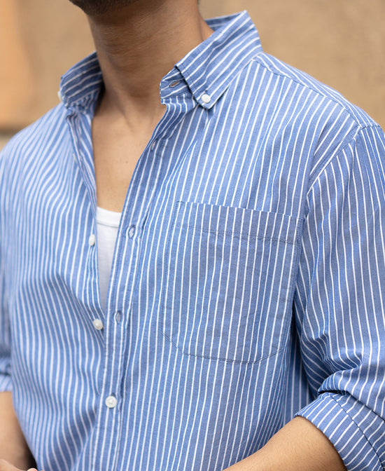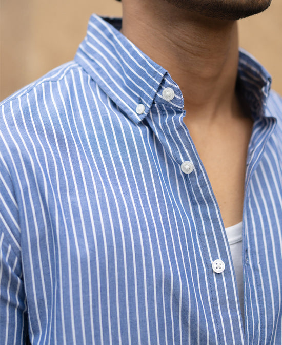 Stay sharp without breaking a sweat in the Blue Lightweight Striped Shirt. Crafted from lightweight textured fabric, it delivers breezy comfort with a timeless stripe pattern. Easygoing yet polished, it is made for days when you want style and ease to move together.