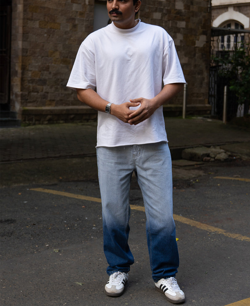 A modern twist on denim essentials. These ombre baggy-fit jeans fade seamlessly from deep indigo to soft blue, giving a statement finish to a relaxed silhouette. Crafted from mid-weight cotton denim with just the right amount of structure, they’re perfect for easy, everyday movement. Pair them with a crisp white tee or a textured overshirt for an effortlessly cool look.