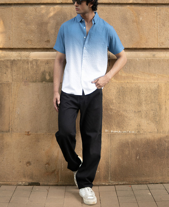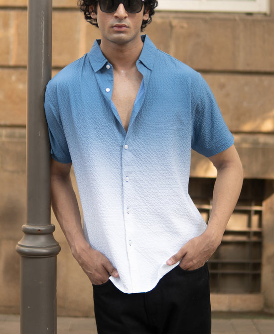 A classic, relaxed statement shirt that fades from cool blue to crisp white. The textured fabric adds dimension, while the short sleeves and open collar keep it breathable and effortless. Ideal for vacation days, city stroll evenings, or casual layering.