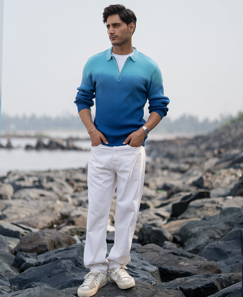 This one feels like the fine work of a movie editor—smooth blue fade from calm to cool. This ombre sweatshirt blends structured cotton with a striking colour transition that feels modern and elevated. Featuring a classic zip-collar neckline, full sleeves, and a relaxed fit. Perfect for layering, beach evenings, or those chill-but-polished moments