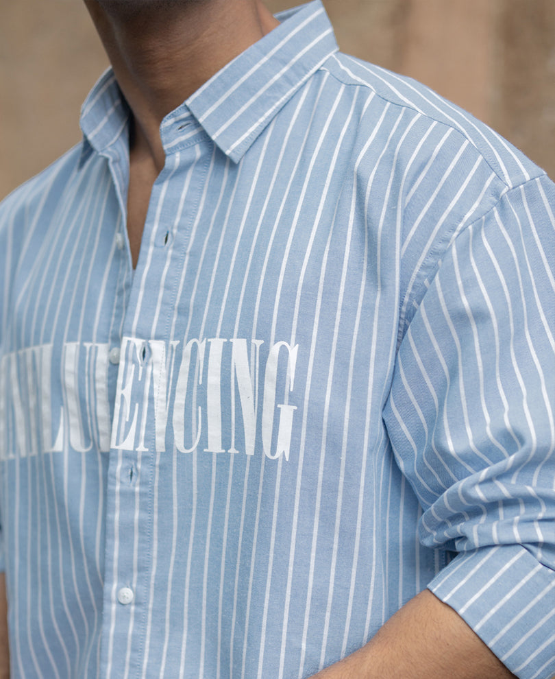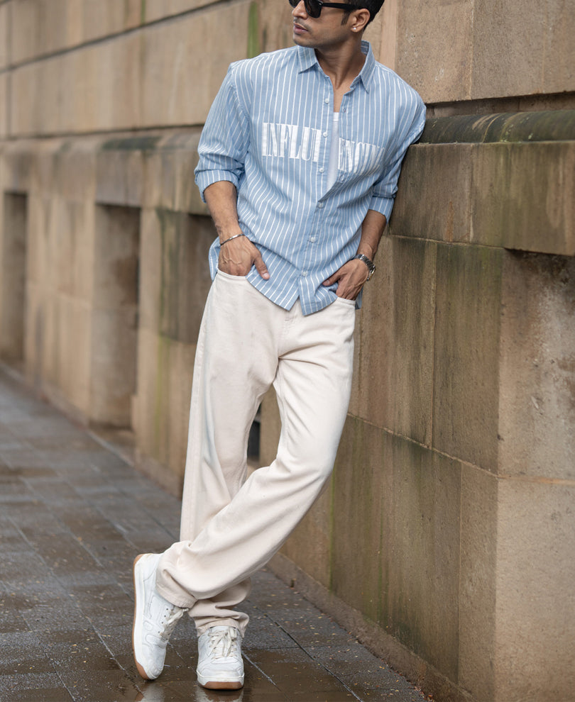 Where vintage stripes meet modern flair. The sky-blue base with crisp white stripes gives this shirt a timeless foundation, while the subtle typography print across the chest adds an edge of individuality. The oversized fit ensures relaxed movement, making it perfect for a weekend brunch or a casual day out.