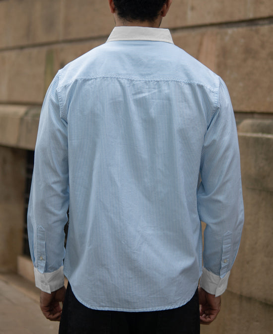 This shirt puts a modern spin on classic Oxford tailoring with fine vertical stripes in blue and white, contrasted by a clean white collar and cuffs. Cut in a regular fit with a buttoned placket, it’s a statement piece that balances sophistication with subtle boldness. Ideal for semi-formal occasions or elevated smart-casual looks.