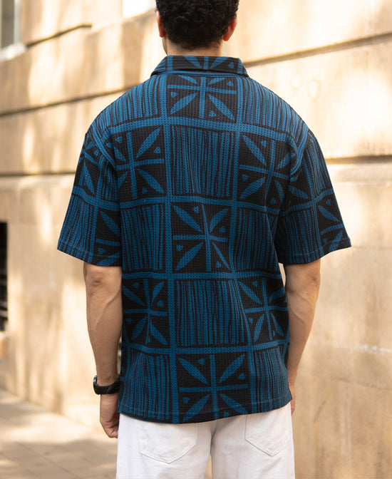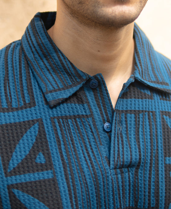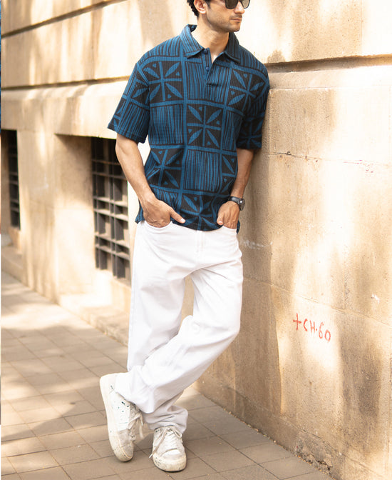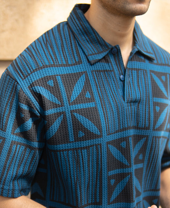 Urban legends just love when a structured knit meets geometric print, and this abstract blue polo does the same. Built for guys who like their basics with bite, it combines bold design with premium comfort. Half-sleeve, textured build, zero dull moments.