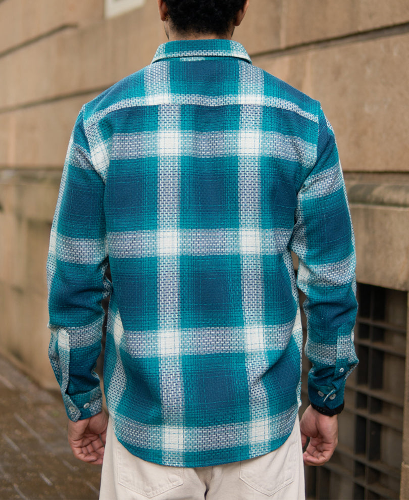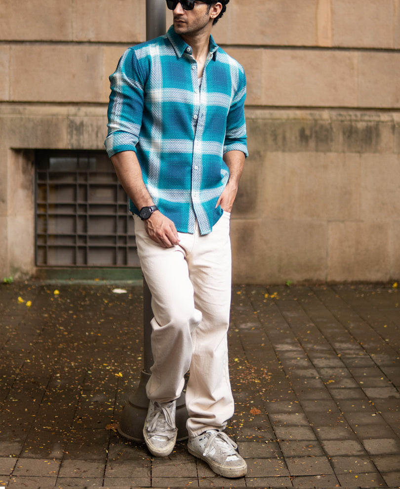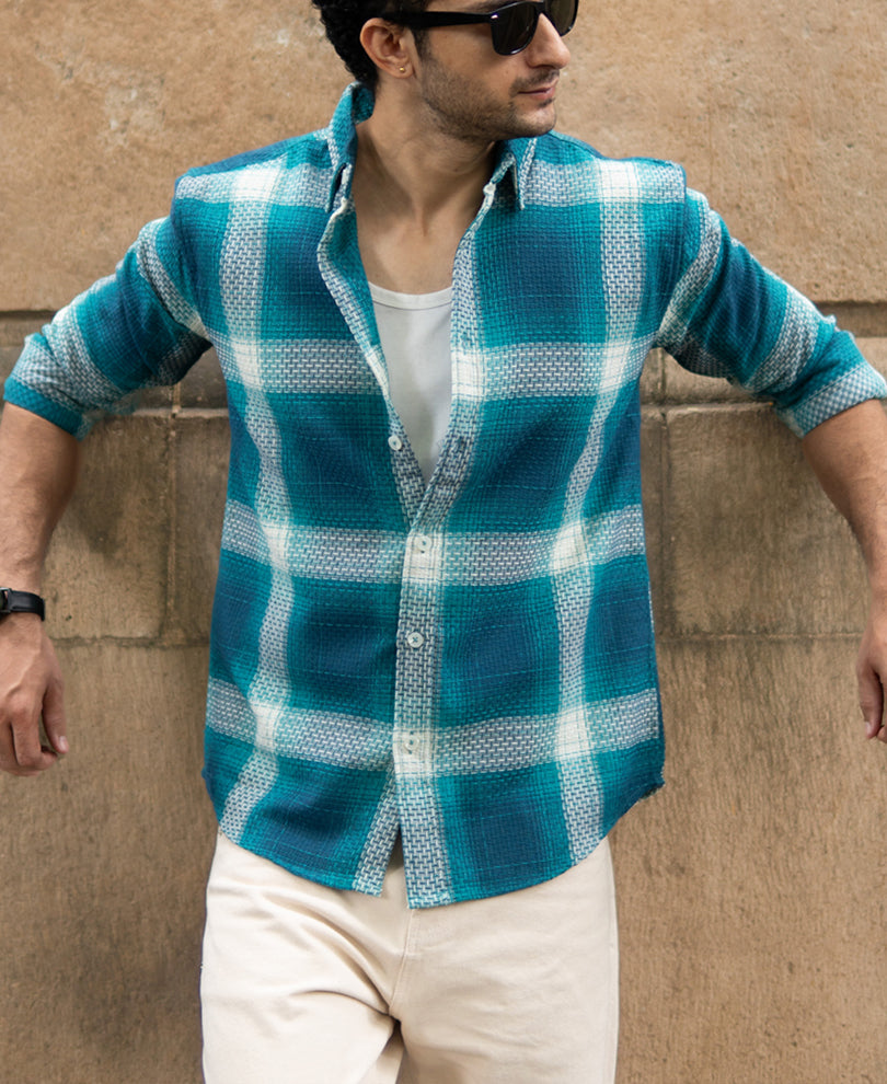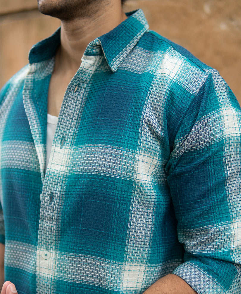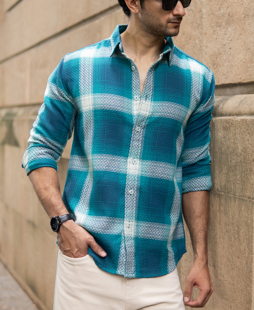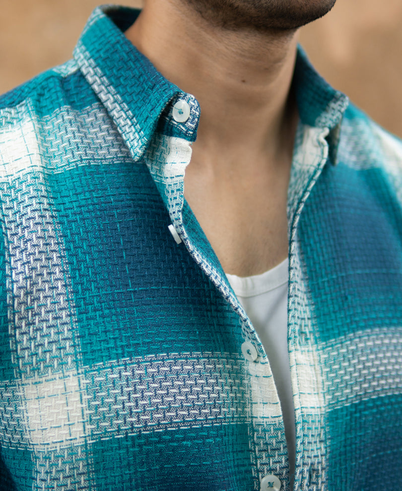This blue structured shirt plays with shades and lines that keep it fresh while holding onto that timeless appeal. Smart, versatile, and never out of place; whether layered or worn solo.