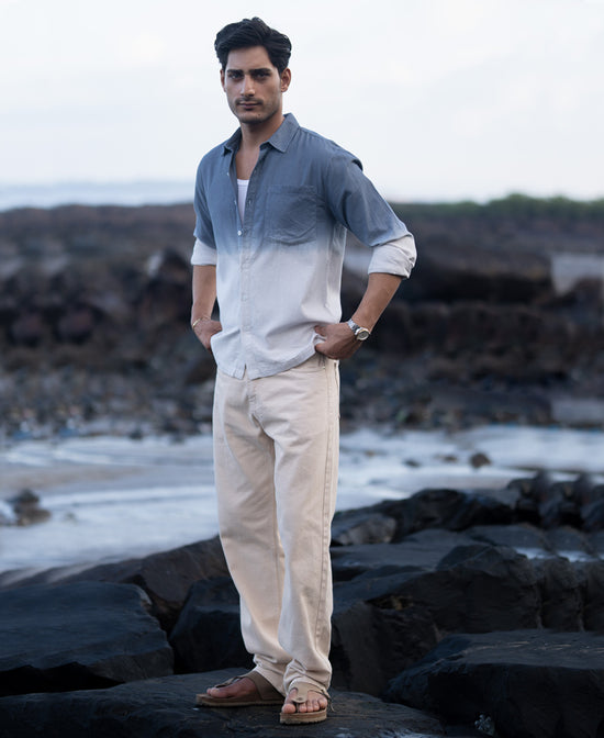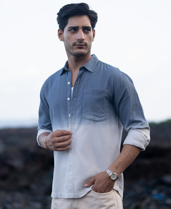 A shirt that captures the calm of fading skies. The Blue Structured Ombre Shirt flows from pale tones into deep sea hues, creating a gradient that’s effortlessly striking. Crafted from breathable cotton with a subtle structure, it’s designed to make a quiet statement.