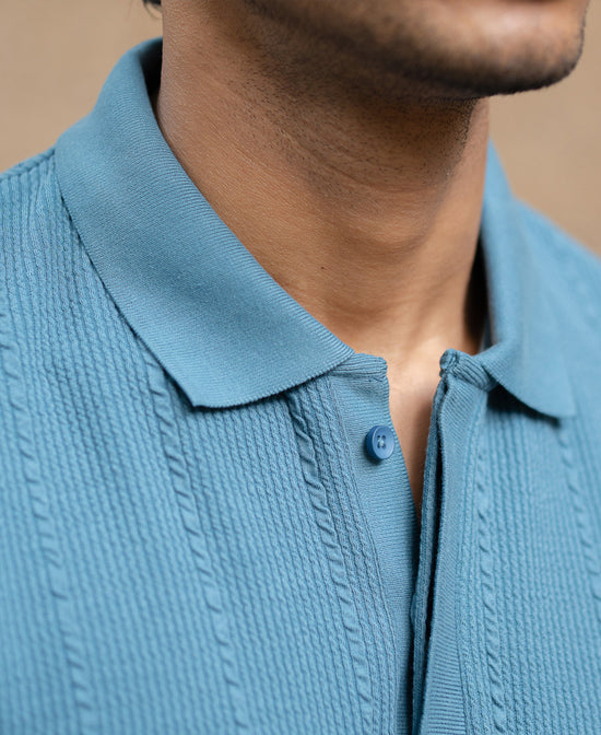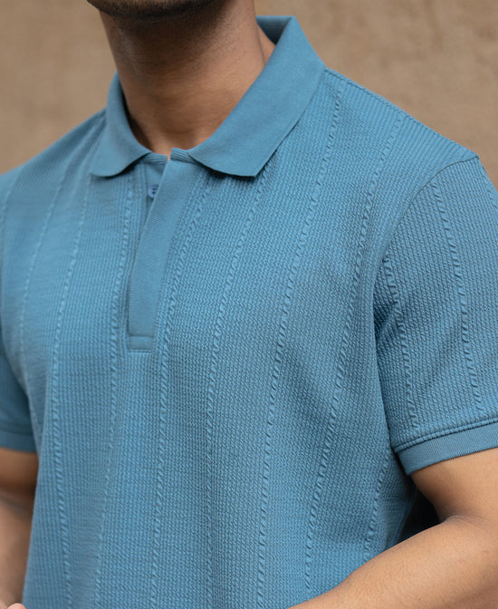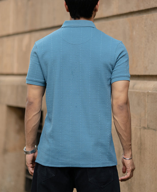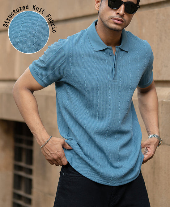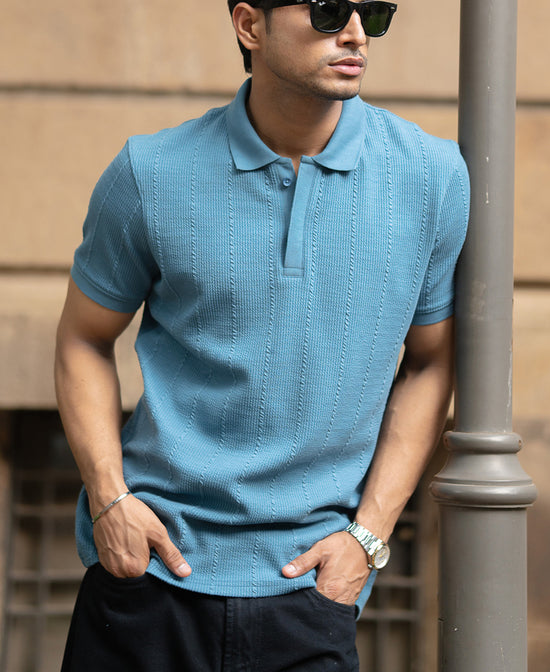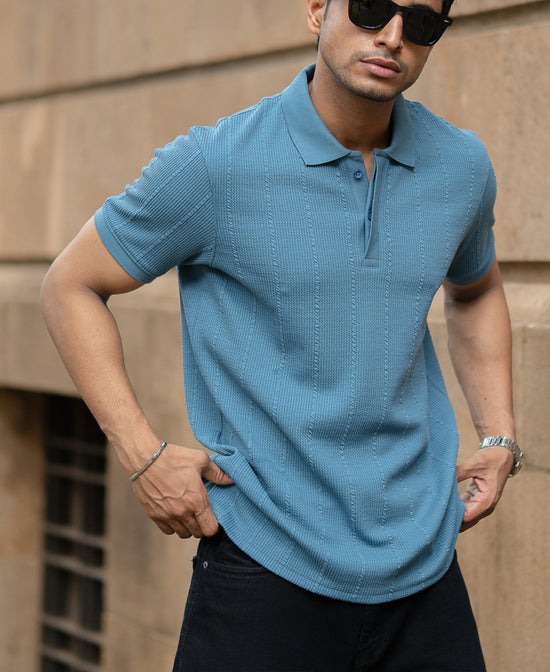 Structure in look, softness in feel. This deep blue polo has a clean, uniform vibe that makes it perfect for daily dressing—but the real flex is in its textured knit. It adds dimension without "you" seeking the attention. Minimal, versatile, and best worn on repeat.