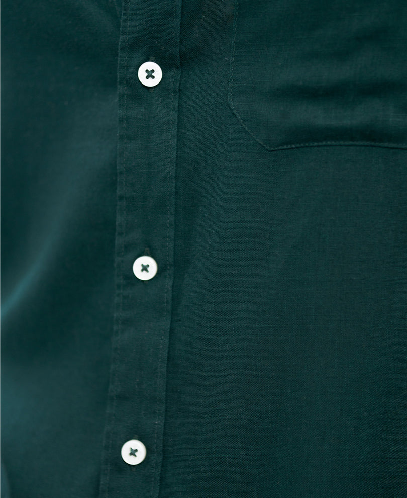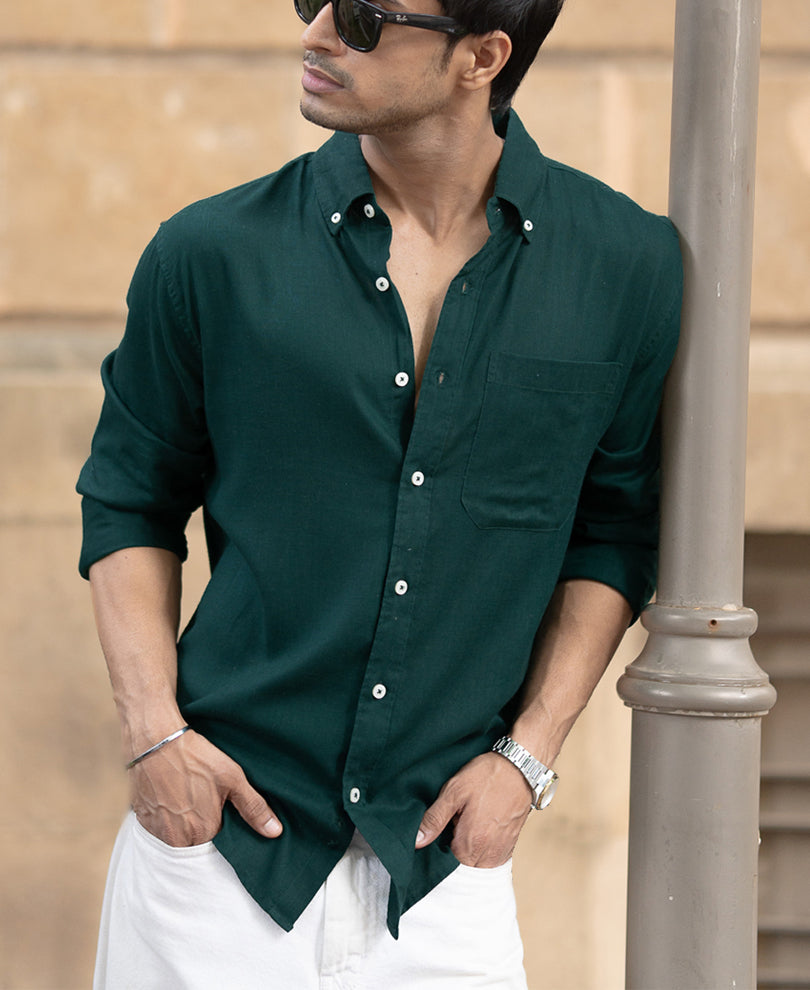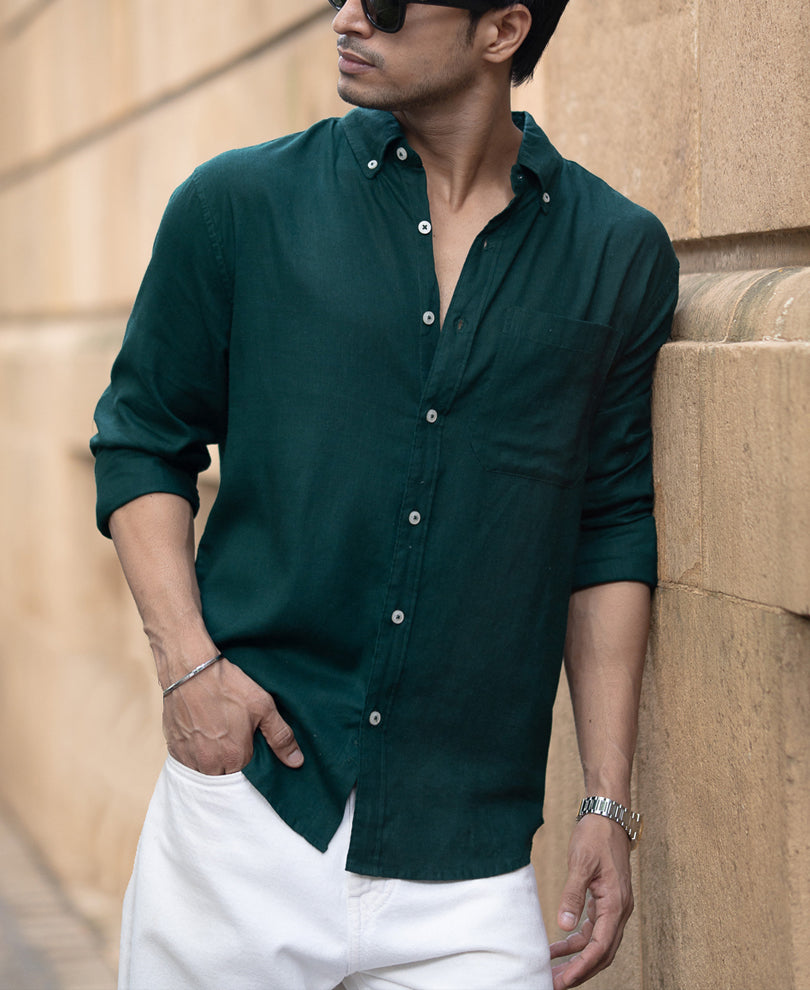 Stay cool and sharp with the Bottle Green Linen Blend Shirt. Crafted from a breathable fabric blend, it offers both comfort and elegance. Its rich color adds depth, making it a standout piece for summer gatherings or casual workdays.