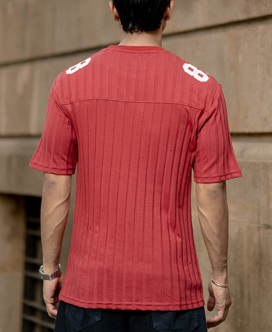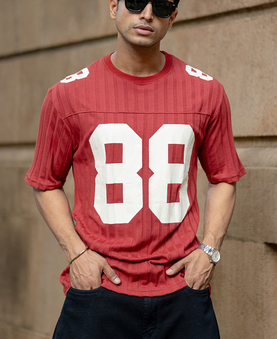 This oversized red tee, featuring bold “88” varsity print and subtle textured stripes, is built like a jersey but made for everyday swagger. Wear it loose with cargos or denim, and you've got instant attitude without the effort.