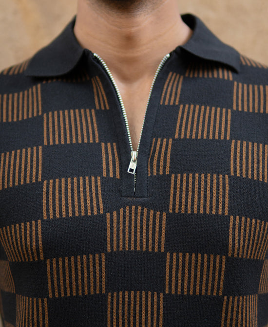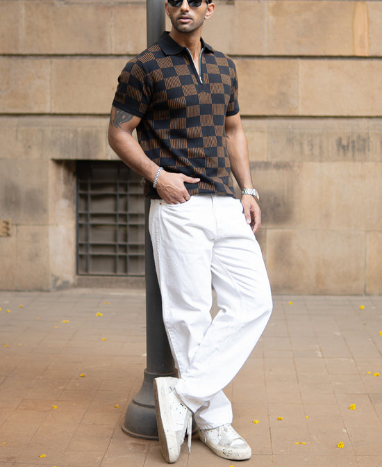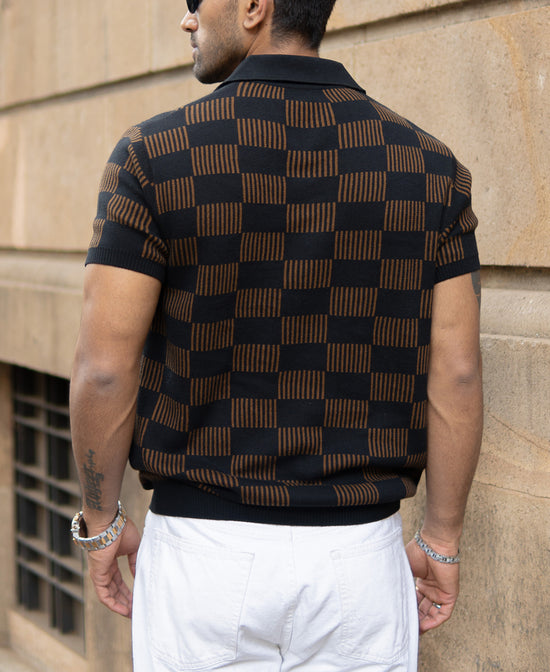 Jacquard but make it chill. This brown and black knit tee brings in texture and detail without feeling flashy. It’s the kind of shirt that looks rich up close but stays casual from a distance. Throw it on, act unbothered, and let the compliments come to you.