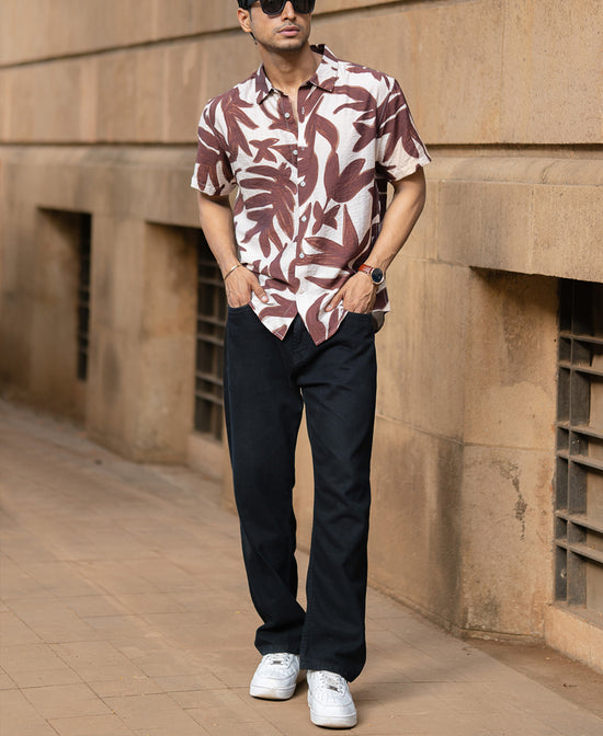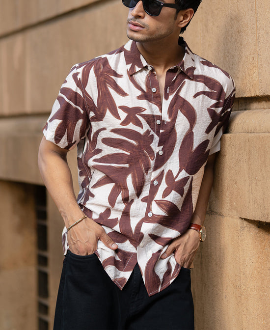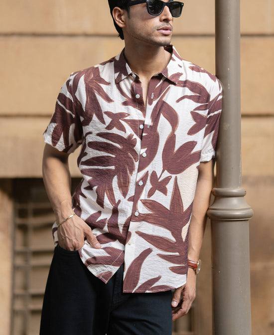 This short-sleeve shirt delivers tropical energy in deep brown tones on an ivory base. The oversized leaf print feels both raw and refined—perfect for city summers or resort getaways. Button up, step out, stand apart.