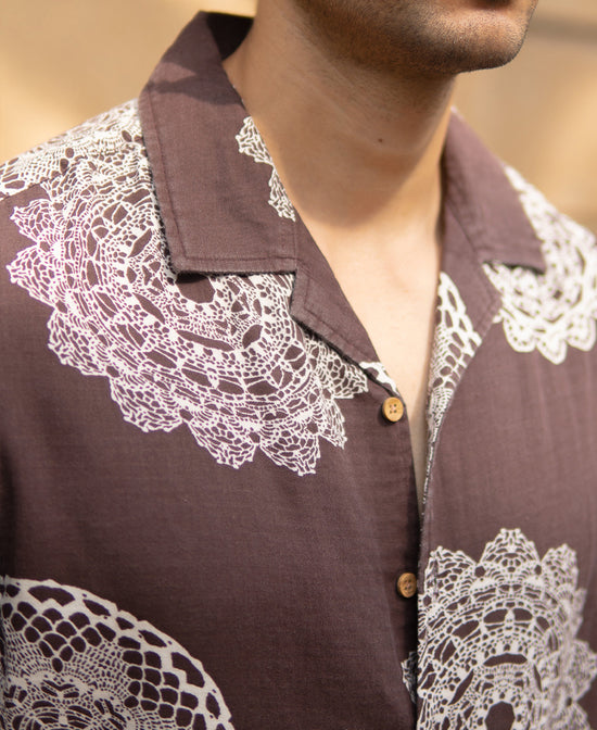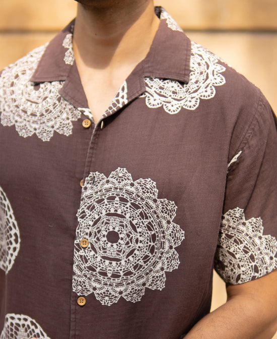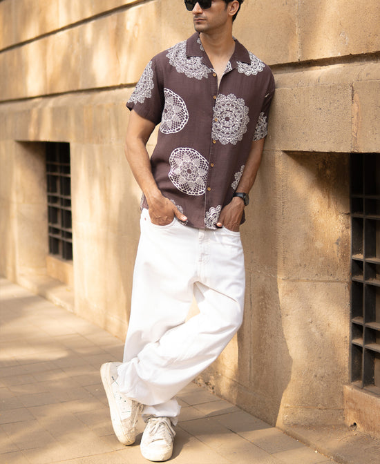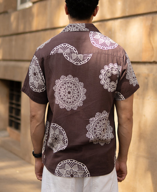 A classic camp shirt with an artistic twist. The off-white mandala motifs bring a handcrafted vibe to this earthy brown piece. Style it open over a vest or button it down for an effortless statement.