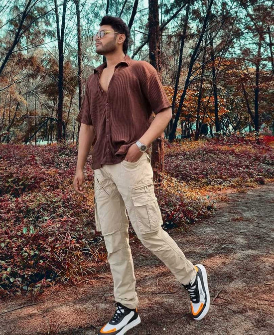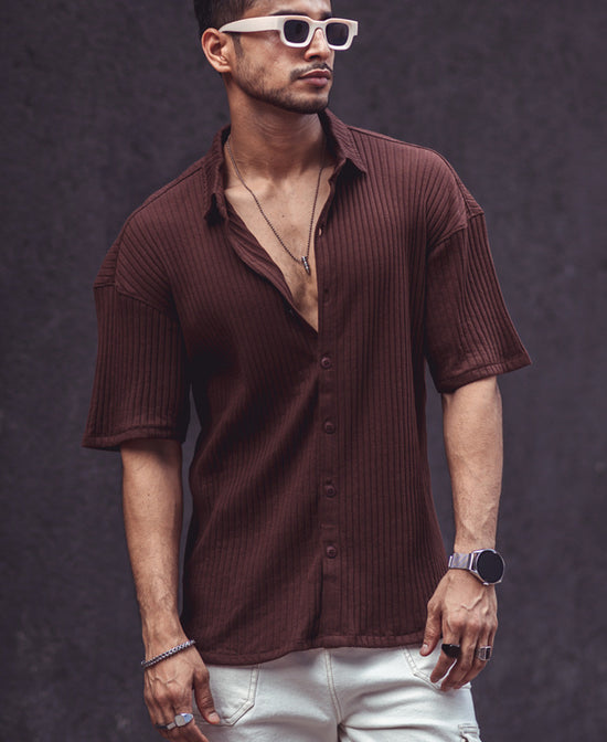 Brown rib knit oversized shirts for men with a spread collar, drop shoulders, half sleeves, and an elegant rib knit. Crafted with blend knitted fabric, this rib knit plain shirt is relaxed to wear yet offers a snug fit. It is a versatile wardrobe piece, so wear it with jeans and sneakers for a casual look or dress it up with chinos and loafers.